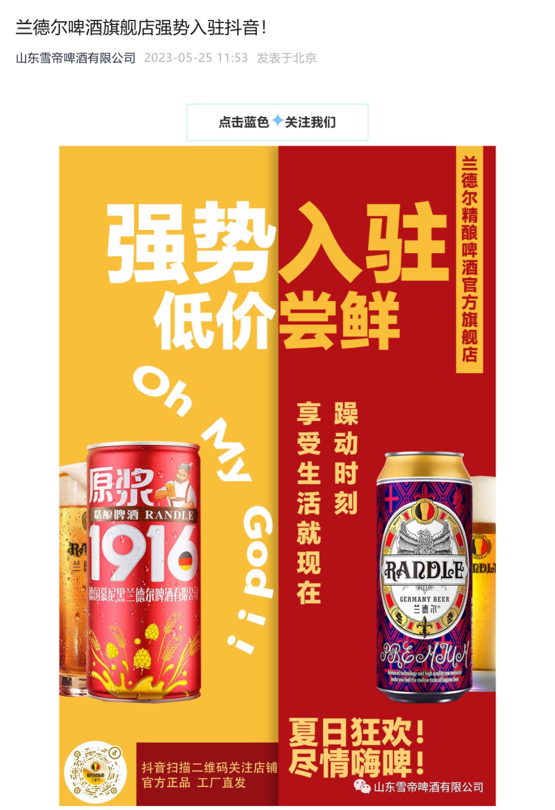 蘭德爾啤酒旗艦店強勢入駐抖音!